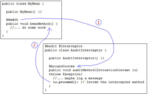 - Just before beanMethod() is invoked, the auditMethod in the AuditInterceptor class is invoked and passes an instance of InvocationContext.