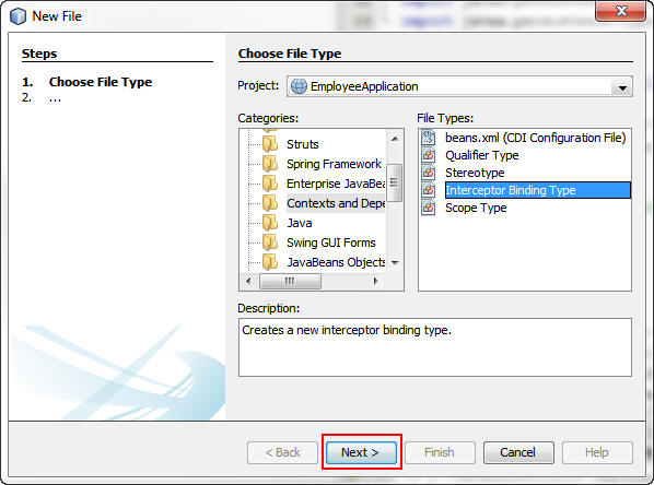 Select Contexts and Dependency Injection from Categories, select Interceptor Binding Type from File Types, and click Next.