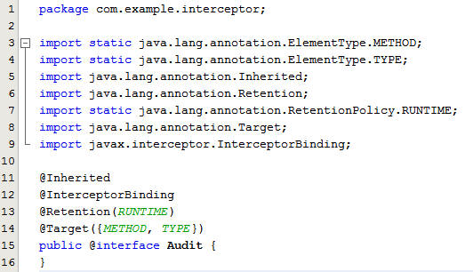 The generated code is an InterceptorBinding annotation type called Audit. You will use this annotation to define when and where you want your Audit interceptor called.
