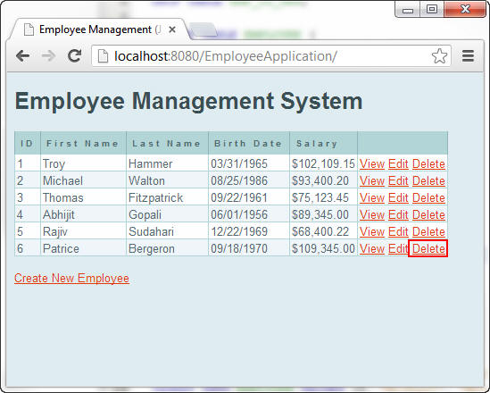 In a browser, enter the URL localhost:8080/EmployeeApplication