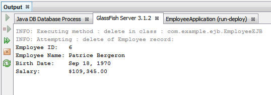 Notice the injection of the EmployeeEJB class. The delete method of the EJB class takes an integer ID for the employee record, so you can use the findById method of the EJB class to delete the employee record.