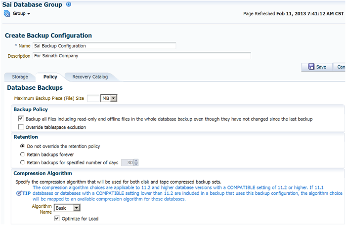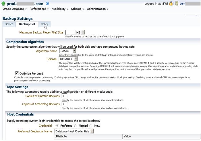 In this tab, you can specify the Maximum Backup Piece (File) Size. as well as the Compression Algorithm (choose Basic, Low, Medium or High compression).