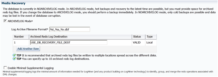 After the FRA is set up, the next step is to enable ARCHIVELOG Mode for the database. This allows you to take online backups and point-in-time recovery. You can enable ARCHIVELOG Mode on the page where you set up the FRA, as shown below: