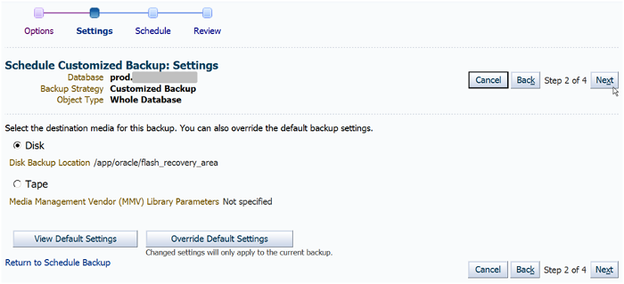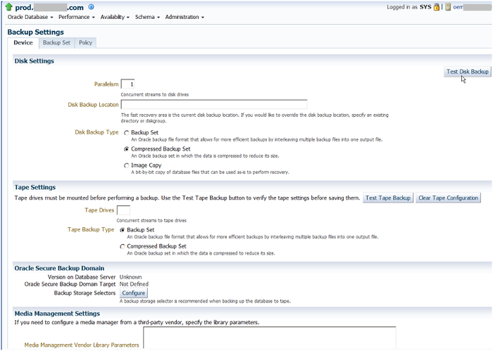 Backup SettingsFrom the Database home page, select Availability > Backup & Recovery > Backup Settings. This page appears: