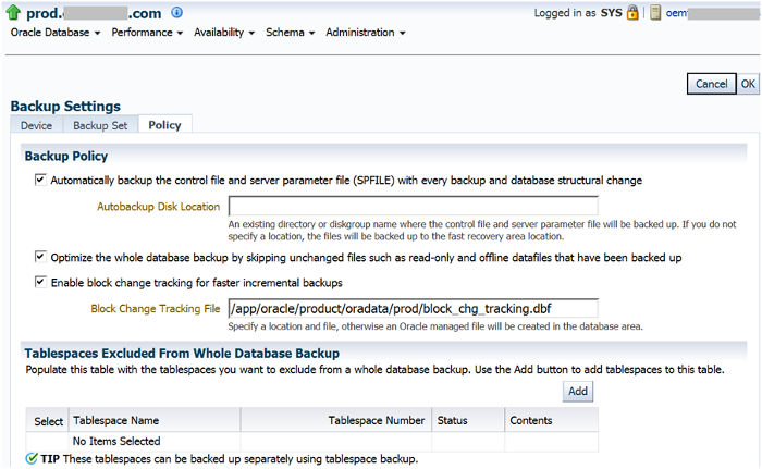 In the Backup Policy tab, you can specify that the Database Control File and Server Parameter File (SPFILE) be backed up automatically with every database backup or database structural change.