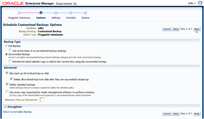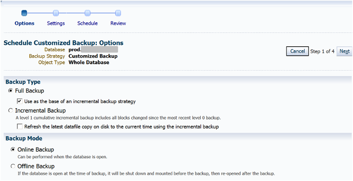 On the next page, we can decide to perform either a full backup, or an incremental backup of the selected PDBs.