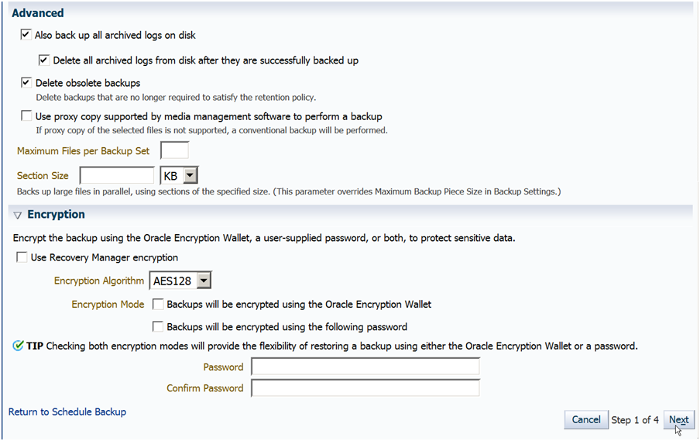 If you decide to select Use Recovery Manager Encryption, you can select encryption using the Oracle Wallet as well as encryption using the password. Specify the password in the field below and confirm. This will encrypt the backup using both these methods. Also, there will be greater flexibility since you can use either the wallet or the password when the RMAN backup needs to be restored. By default, AES128 is selected as the Encryption Algorithm. We have decided not to use encryption in this case.