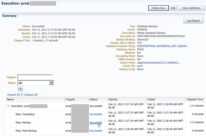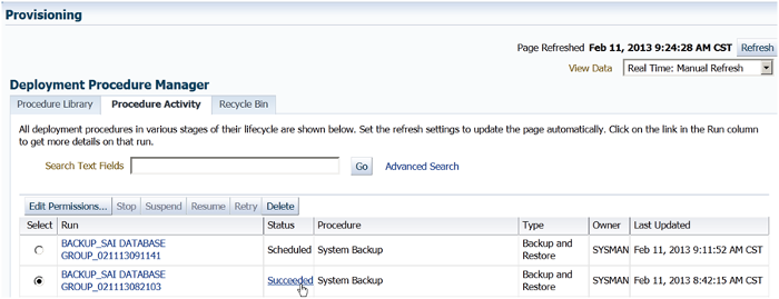 You can view the completed group backup jobs by selecting Enterprise > Provisioning and Patching > Procedure Activity from the Enterprise Manager menu.