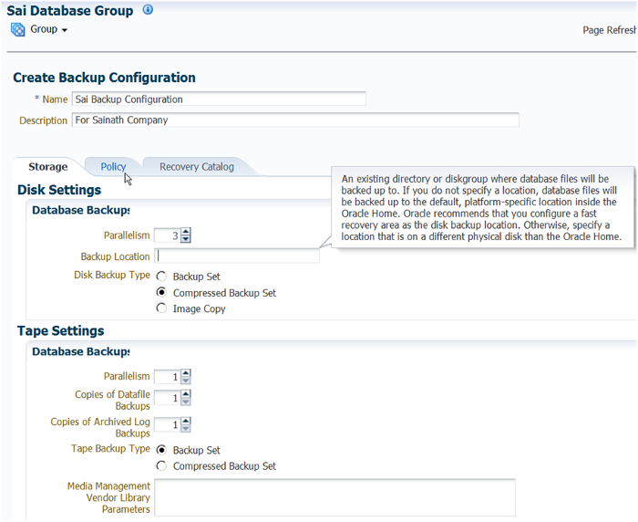In the Disk Settings section of the Device tab, select a Parallelism of 1 (the default) and the Disk Backup Type Compressed Backup Set. Selecting a larger parallelism will increase the number of concurrent RMAN streams to the disk backup location; use this feature with care, since it depends on how much the disk can handle. Using such a setting will increase the speed of the backup, but this will also depend on the disk subsystem structure.