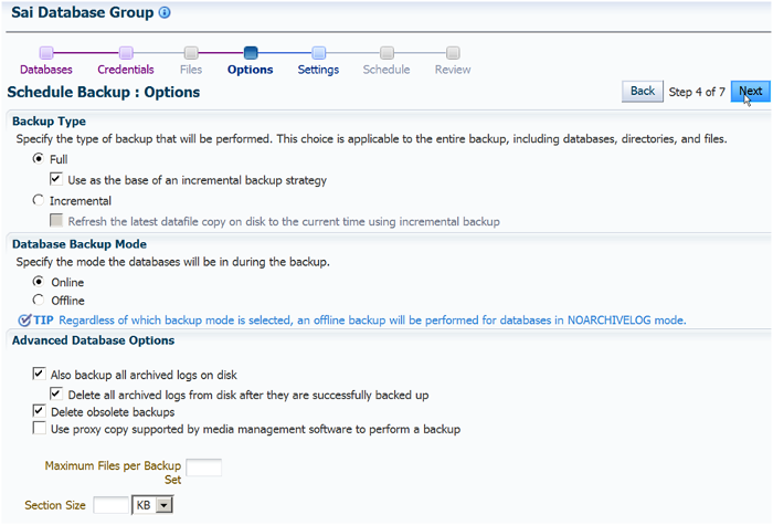 Selecting these options configures the backup to include all archive logs with the full database backup and deletes the archive logs from disk after they are backed up. To delete backups marked as obsolete (as per the retention policy), select Delete obsolete backups.
