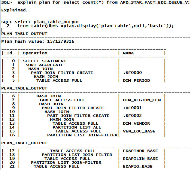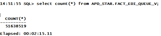 Revisando la definición de la vista física FACT_EDI_QUEUE_V, encontramos cuatro tablas físicas grandes en base a las cuales la vista está construida: EDAPIHDR_BASE , EDAPIQ_BASE , EDAPIQ_BASE VEN_LOC_BASE. A través de la vista, la consulta SQL asociada a ésta,produce operaciones de “full table scan” sobre estas cuatro tablas. Decidimos entonces colocar las mismas dentro del “Oracle Database In-Memory area”.