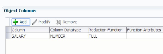 action => DBMS_REDACT.ADD_COLUMN, column_name => '"SALARY"', function_type => DBMS_REDACT.FULL );