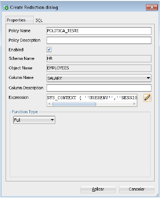 Crear la misma política usando SQLDeveloper: