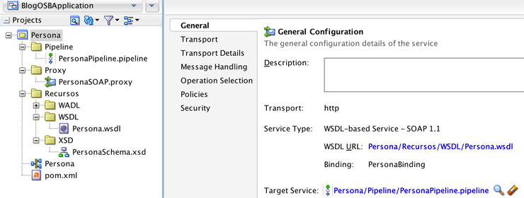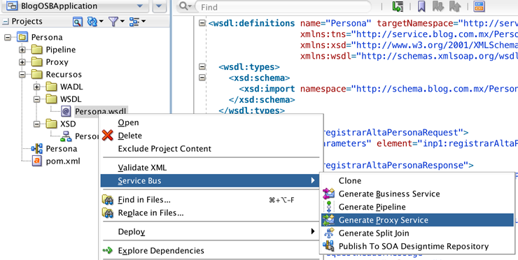 El siguiente paso es crear el servicio proxy a partir del WSDL y el XSD. Para esto, en JDev una vez que se ha creado la estructura del proyecto y ambos archivos, dar clic derecho sobre Persona.wsdl, Service Bus, Generate Proxy Service.