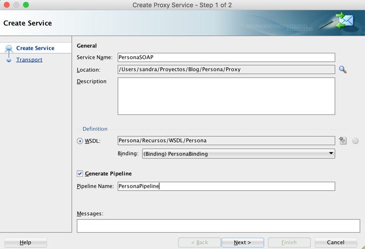 Esto abrirá la ventana de creación donde debemos configurar el nombre del servicio proxy SOAP, seleccionamos el binding que creamos previamente el WSDL, y seleccionamos la opción Generate Pipeline. Next.