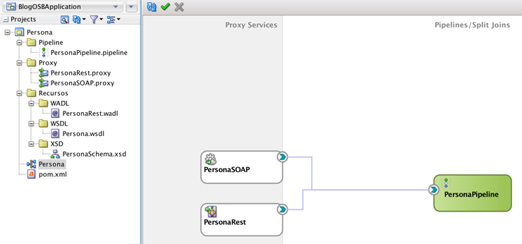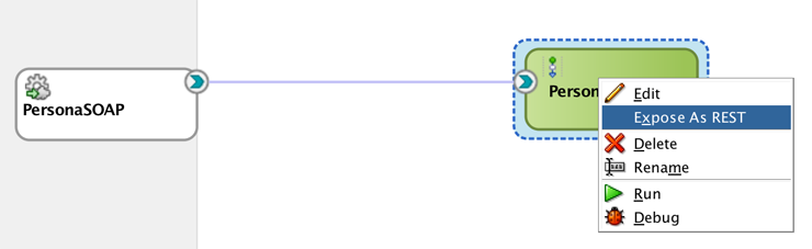 Ahora abramos el archivo llamado Persona (equivalente al Composite.xml en BPEL), localizado en la parte inferior izquierda del proyecto. Clic derecho sobre el Pipeline y Expose As REST.