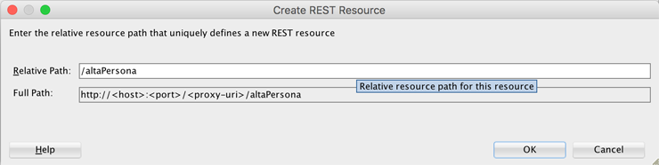 Doble clic sobre el registro vacío de la tabla Resources, mismo que tiene solo una diagonal '/'. Esto abrirá la ventana para establecer el path del recurso. En este caso yo le llamé /altaPersona. OK.
