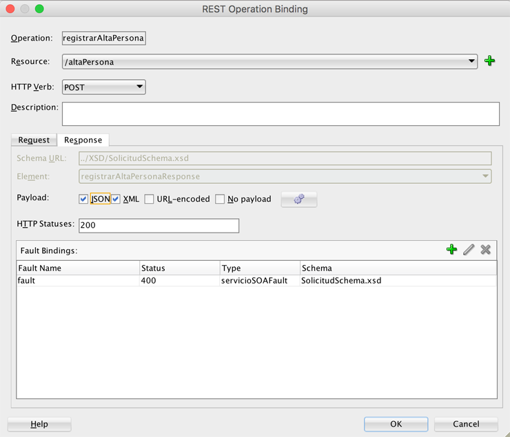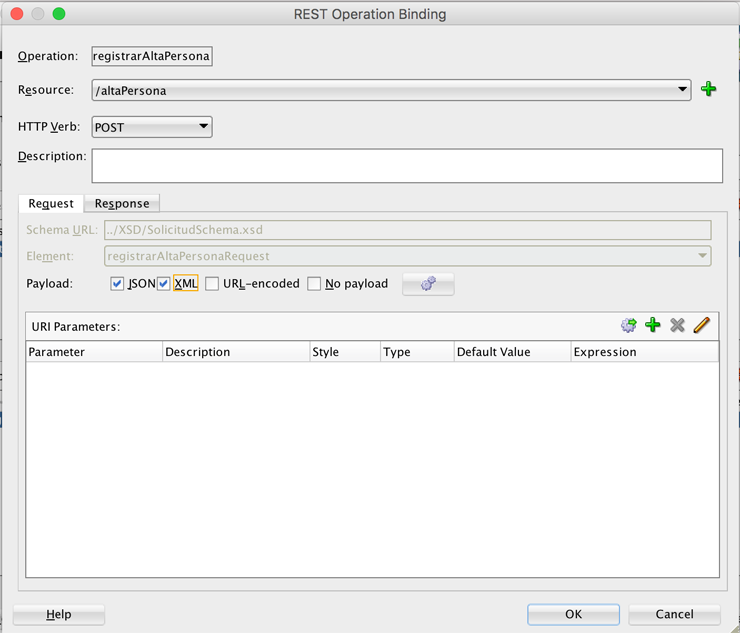 Esto abrirá la ventana de configuración donde elegiremos el recurso y el verbo HTTP, en este caso escogí POST debido a que mi operación ficticia es un insert en el servidor. En la pestaña de Request, se ha mapeado automáticamente el elemento del XSD, y podemos elegir si el servicio REST recibirá mensajes en formato JSON y XML, entre otras cosas.