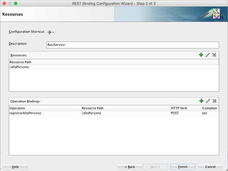 Una vez que hemos terminado de vincular las operaciones con los recursos, veremos la pantalla completa como se muestra a continuación. Finish para terminar.