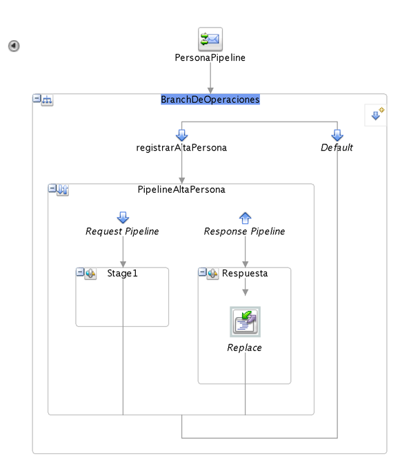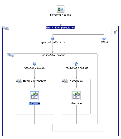 Agregué una actividad Operational Branch y dentro de ésta agregué un PipelinePair para la operación registrarAltaPersona y en el Response Stage puse una actividad Replace para simular la respuesta Mock del servicio y poder probarlo.
