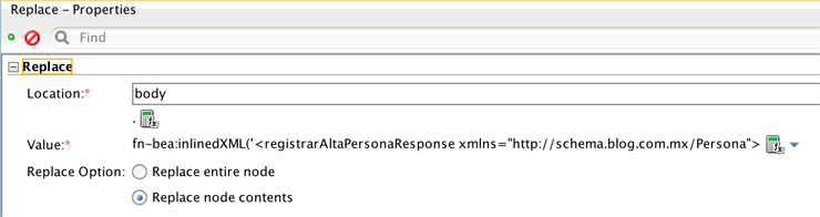 Las propiedades de la actividad Replace se ven así: