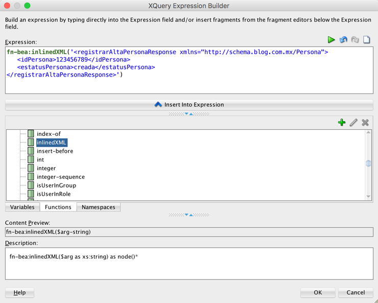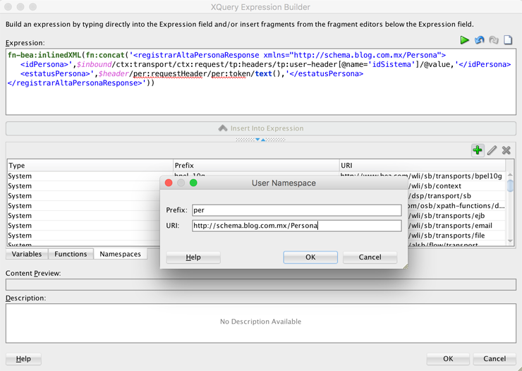 '))Es probable que en este punto se presente un error al editar la función xQuery, esto debido a que no está declarado el namespace con prefijo per, si esto ocurre, solo es necesario agregarlo en la pestaña namespaces.