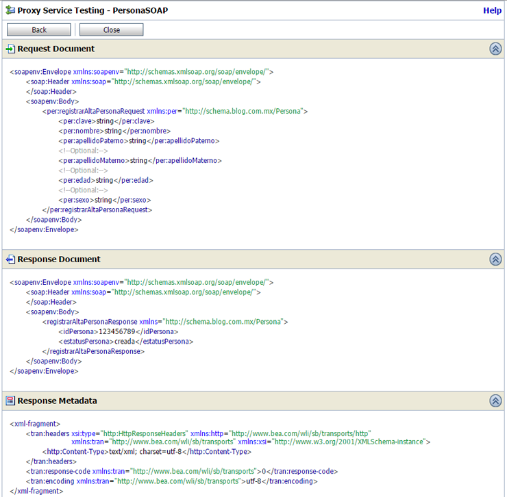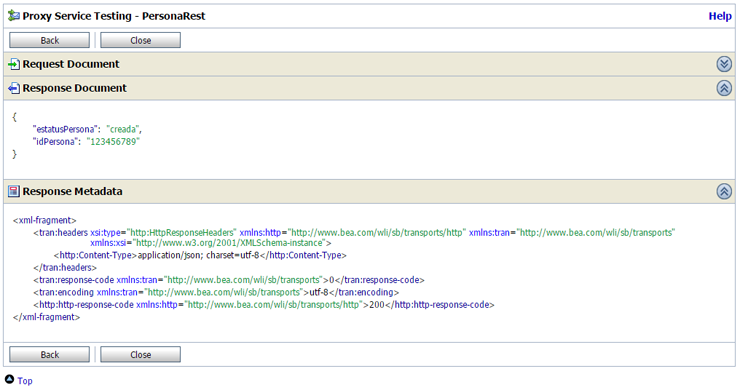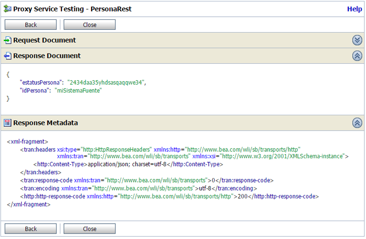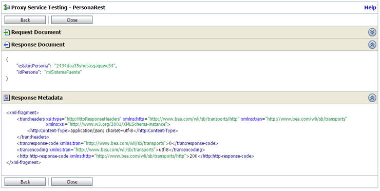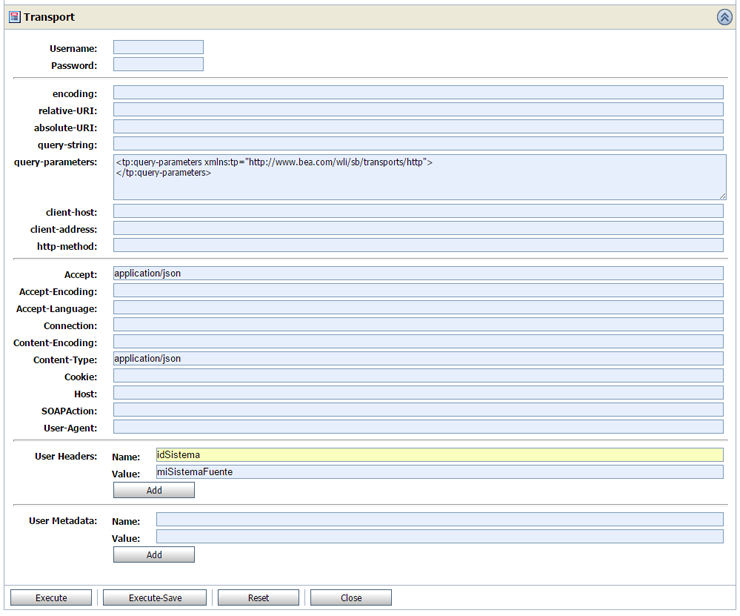 Despleguemos y probemos el servicio enviándole los atributos idSistema y token en el header del transporte HTTP. Esto lo podemos hacer en la consola de pruebas de OSB en la sección User Headers en la parte Transport.