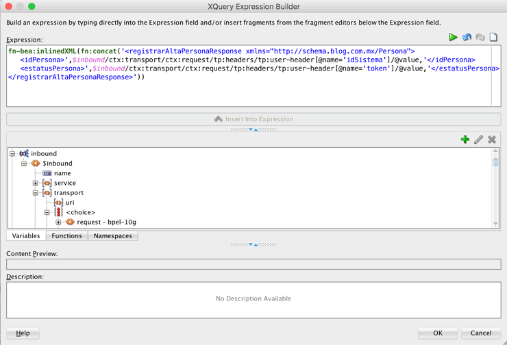 Ahora bien, la parte más interesante de este post está relacionada a leer el header de los mensajes del servicio de tipo REST, por lo que modifiqué el xml de respuesta para obtener del header los dos atributos; idSistema y token, y los concatené a la salida del mensaje para que sean fácilmente visibles en la prueba, por lo que la expresión queda de la siguiente forma:
