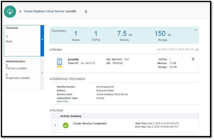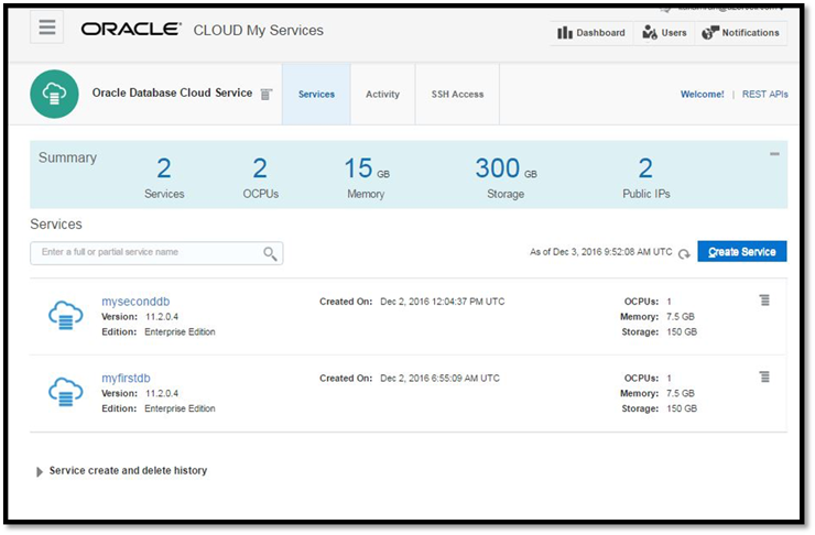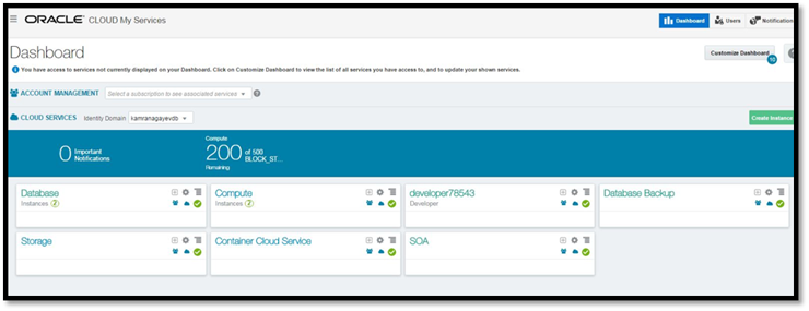 Em seguida, o dashboard Oracle Cloud Services dashboard será mostrado.