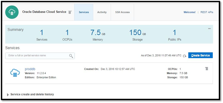 Depois de conseguir seu registro você vai receber um e-mail com suas credenciais de acesso. Clique no link especificado no e-mail, forneça seu usuário e senha e faça login na sua conta na Oracle Cloud. Clique no link Oracle Database Cloud Service.