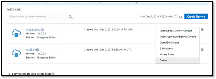 Clique em "Delete" no menu de cada database service para excluir o banco de dados.