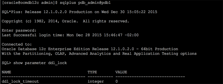 A persistência dos parâmetros no CDB e PDB possuem as mesmas implicações de antes. Os parâmetros estáticos só terão efeito se você reiniciar o banco de dados enquanto parâmetros dinâmicos entrarão em vigor imediatamente. Além disso, se você desplugar um PDB e depois replugar em outro CDB, os parâmetros alterados serão transferidos também. Uma observação importante, é que ao utilizar CONTAINER=ALL na alteração do parâmetro no CDB, o valor desse parâmetro também será alterado em todos os PDBs, mesmo que ele já tenha sido alterado no PDB.