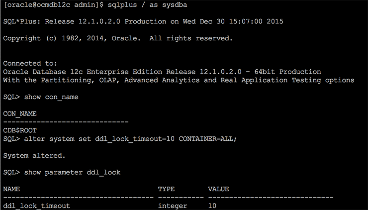 Para alterar os parâmetros de um CDB, basicamente procedemos da mesma forma utilizada anteriormente nos bancos non-CDB. Adicionalmente podemos utilizar a cláusula container.