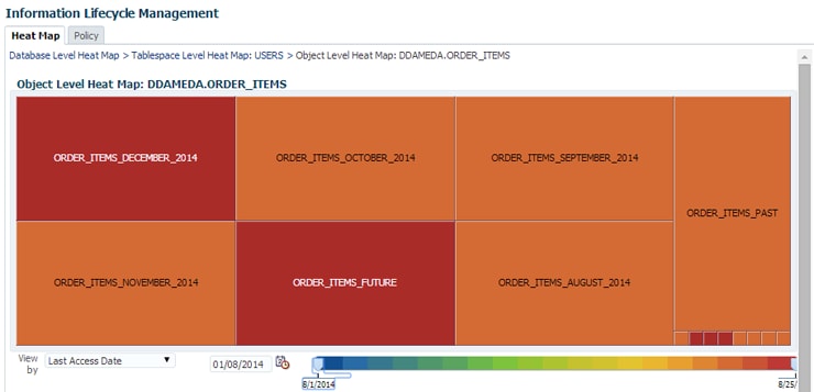 Pode-se verificar, na figura 1 acima, que as partições da tabela ORDER_ITEMS que estão sendo acessadas com mais frequência estão na cor vermelha. Note que não é necessária a presença de políticas de ADO para que o Heat Map colete as estatísticas referentes a utilização dos objetos.