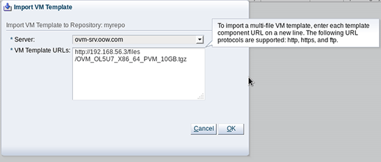 Importing objects (templates, ISO images, and so on) into Oracle VM can be done in several ways: