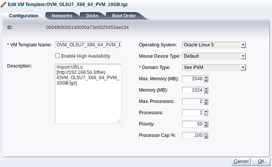 - Import the Oracle Linux 5 Update 7 PVM Template