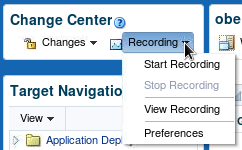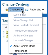 The Change Center also provides a drop down list for managing WLST recordings. FMWC WLST recording works the same way it works within the WebLogic Server administration console. When you use FMWC to make configuration changes in your domain, the WLST commands for those changes are written to a file. You can use the recorded WLST commands as a starting point for writing your own WLST scripts.