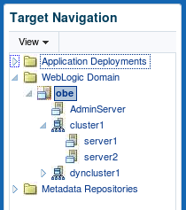 The left-hand side of the page provides the Target Navigation tree panel. You use this panel to manage the components of your domain, including applications, servers, clusters, and more.