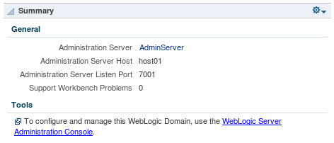 The upper left-hand corner of the main frame shows a general summary portlet of your domain's administration server and provides a link to open the WebLogic Server administration console. You can move the portlet by clicking its gear icon or by dragging and dropping it on the page. The administration server name is a link. You click the link to view more details about the administration server.