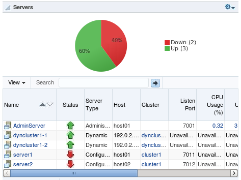 Below the Summary portlet is the Servers portlet. This portlet displays the servers that are configured in the domain, their status, their type, their location, and some useful statistics. Each server name is a link. You click a link to view more details about a server. Note that your screen may look slightly different than mine because I have an extra dynamic cluster configured. This will not affect your experience.