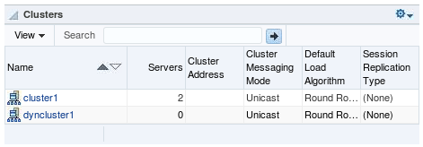 To the right of the Summary portlet is the Clusters portlet. This portlet displays the clusters that are configured in the domain, the number of servers configured in the cluster, and more. Each cluster name is a link. You click a link to view more details about a cluster.