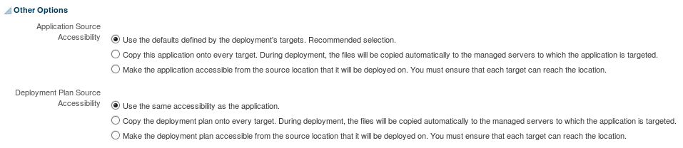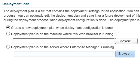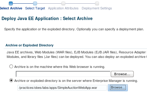 A deployment wizard guides you through the deployment process. Select the Archive or exploded directory is on the server where Enterprise Manager is running option and enter the location where you uploaded the application file.