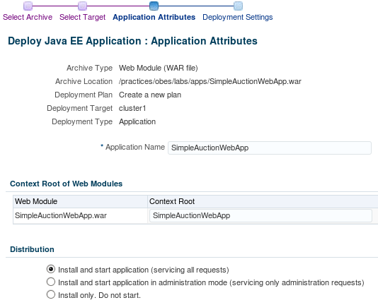 Leave all of the default settings for application name, context root, and distribution fields. Review these values.