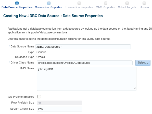 Enter JDBC data source properties the way that you normally would, including its name, driver class name, and JNDI name.