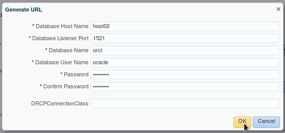 Enter the settings that match your database, including host name, port number, database name, database user name and password, and click OK.
