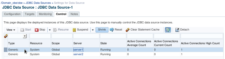 Click the Control tab to display your data source as it is deployed across the domain. If you deployed it to a cluster then you should see an instance of your data source on each server in the cluster. Select one of the rows in the list. The toolbar above the list activates for that data source instance. Experiment for a few minutes with some of the actions you can perform on your data source.