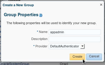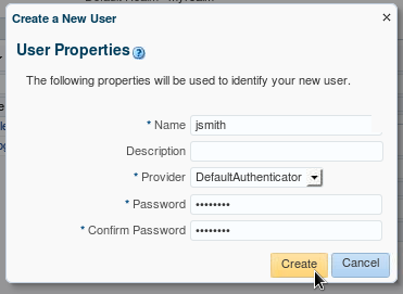 Enter the user name and password for the user. If multiple authentication providers are configured, then you can select the authentication provider (identity store) in which to store the user. Choose the DefaultAuthentictor provider and click Create.
