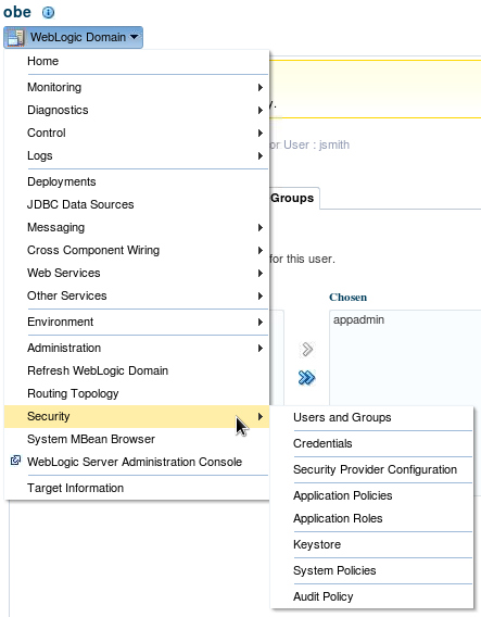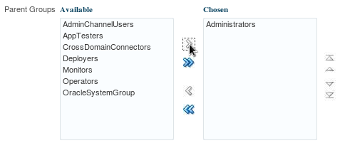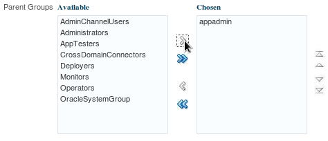 icon to move the group into the Chosen section. This effectively makes the appadmin group a member of the Administrators group. After assigning the jsmith user to the appadmin group, jsmith will effectively be a WebLogic administrative user.