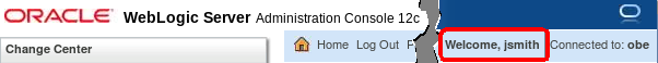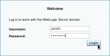 If you configured everything successfully, then you will log into the WebLogic administration console as the jsmith user. The upper right-hand corner of the page should welcome the jsmith user.