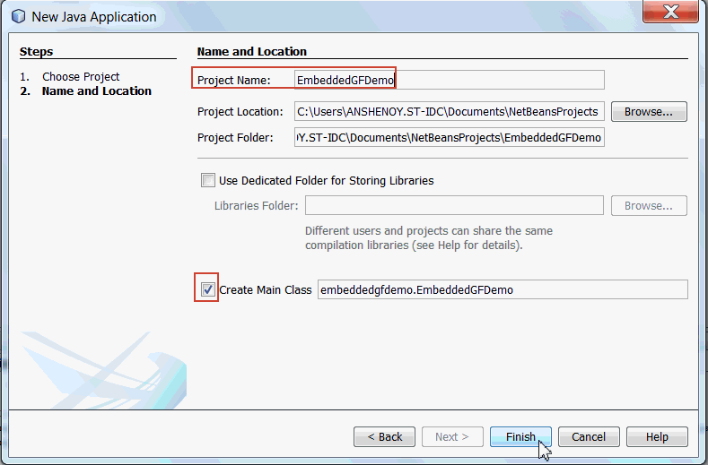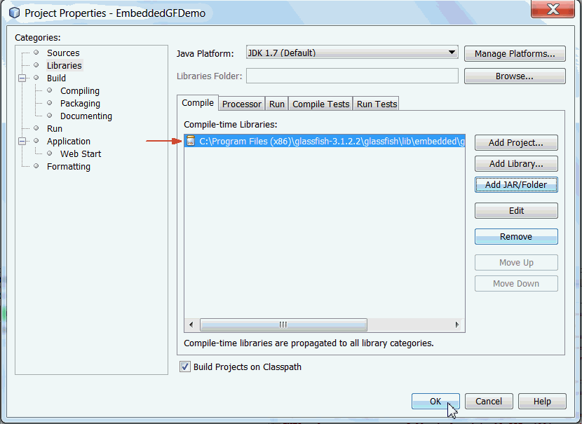 Add the GlassFish embedded EJB container to the classpath of the EmbeddedGFDemo project by completing the following steps